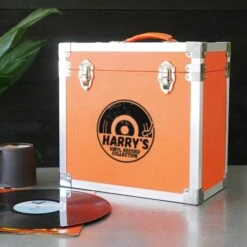 Personalised 12 Inch Record Storage Box – Red Leather Effect With Metal Trim – Half Record Sticker