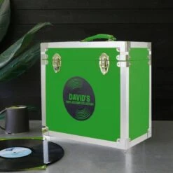 Personalised 12 Inch Record Storage Box – Green Leather Effect With Metal Trim – Record Sticker