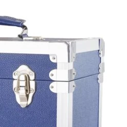Personalised 12 Inch Record Storage Box – Navy Cloth With Brown Leather Trim – Record Laser Etched