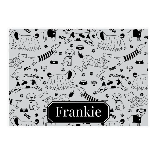Personalise this Dog Patterned Pet Bowl Mat with your dogs name using up to 12 characters.