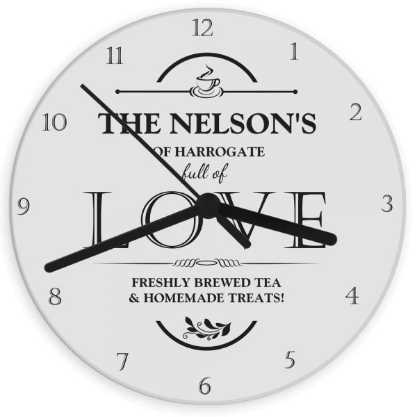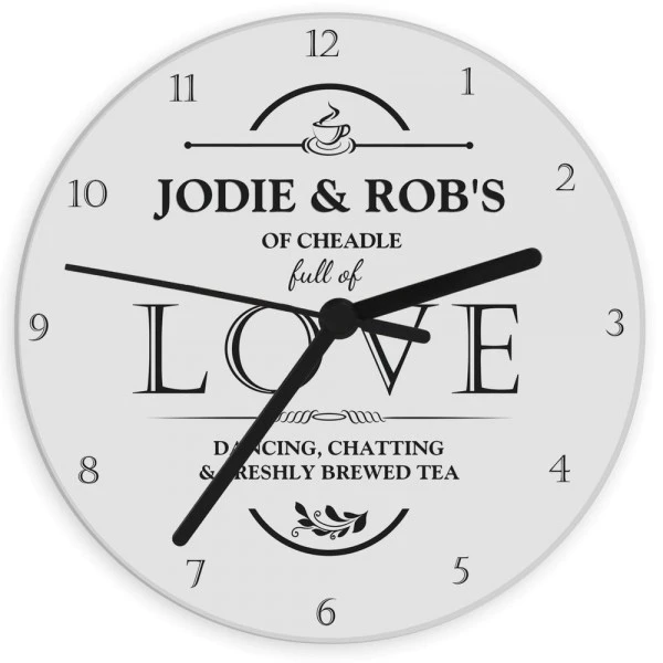 Personalise this Full of Love Clock with a name(s) or message up to 15 characters, a place up to 20 characters (please include “of” if required on the place), and a further 2 lines of up to 30 characters each for a message.