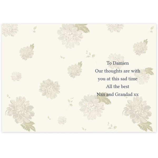 The front of the card can be personalised with a message over 2 lines, with up to 20 characters per line. The inside of the card can be personalised with a message over 5 lines, with up to 20 characters per line.