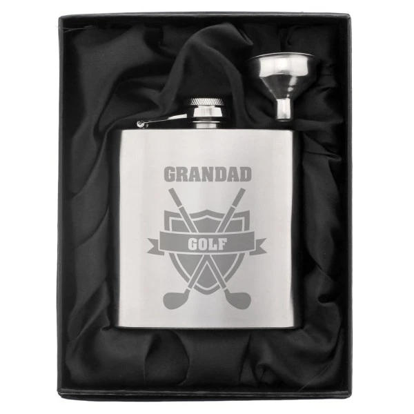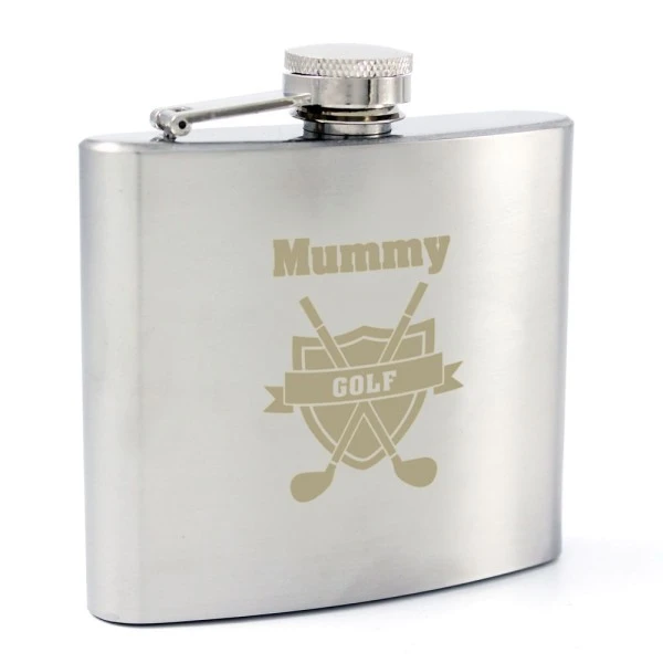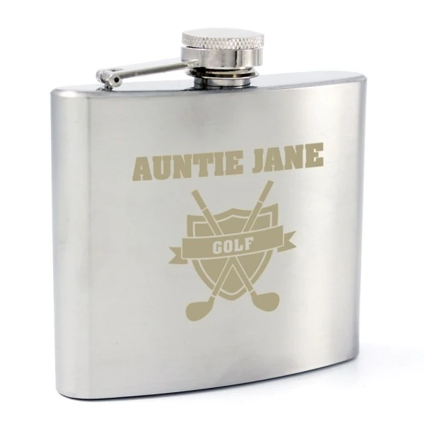 You can personalise this Hip Flask with a name up to 12 characters which will appear at the top. The word “GOLF” is fixed text.