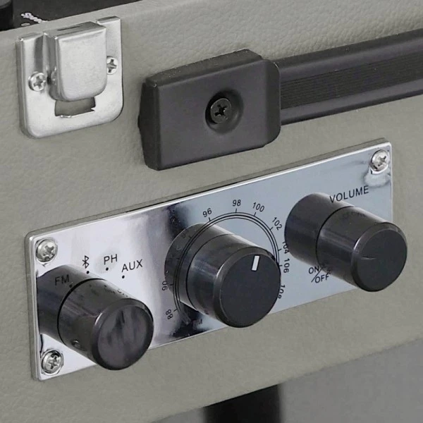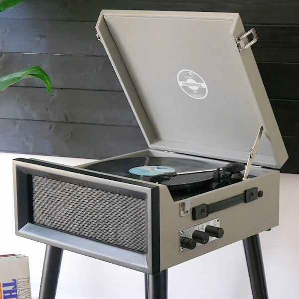This record player has a beautiful Grey Vinyl leather look on the exterior, a Black wooden front and a great looking turntable deck under the lid. One of the best features of this record player is the detachable wooden legs, allowing you the freedom to style this record player anywhere in your home (legs included). The 2 x 20 W P.M.P.O built in speakers create a clear full sound.