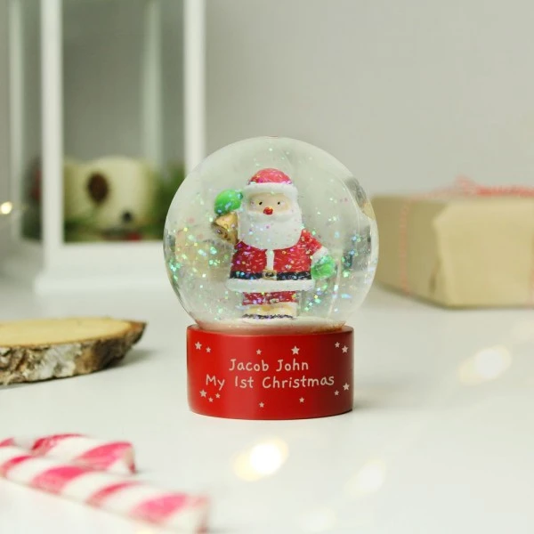 Personalise this ornamental Santa Snow Globe with a message over two lines, using up to 20 characters per line.