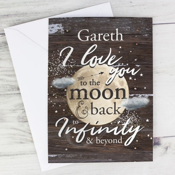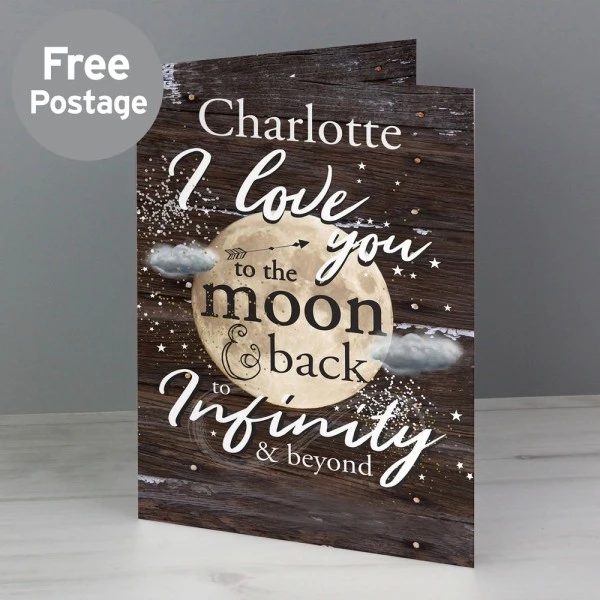 You can personalise the front of this card with a name at the top up to 12 characters. The words “I love you to the moon & back to infinity & beyond” are fixed.