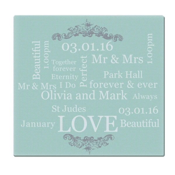 The words “LOVE”, “I DO”, “Beautiful”, “forever & ever”, “Always”, “Together forever” and “Eternity” and “Perfect” are fixed. You can then personalise as listed below: