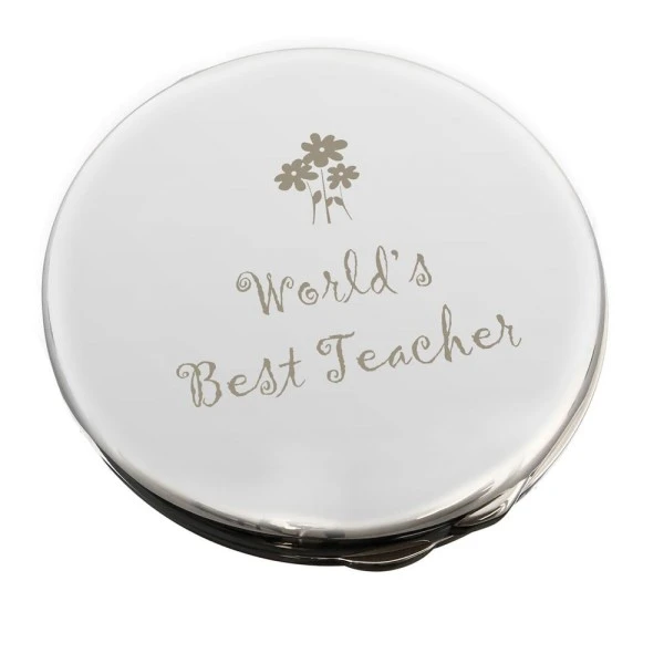 This silver finish round compact features the flowers motif and the wording “World’s Best Teacher” as standard text.